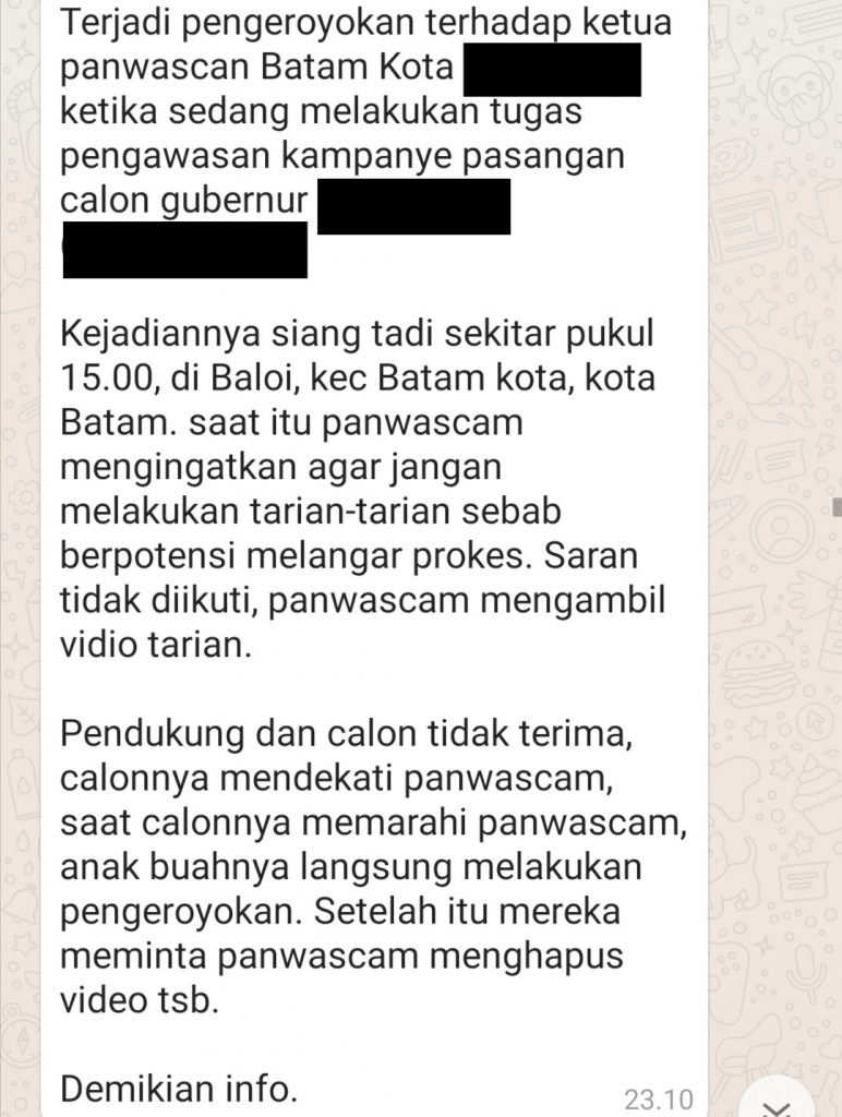 Selain itu, peristiwa pengroyokan Panwascam Batam Kota ini juga telah dibagikan ke Facebook oleh Said Abdullah Dahlawi, salah seorang anggota Bawaslu Kepri.