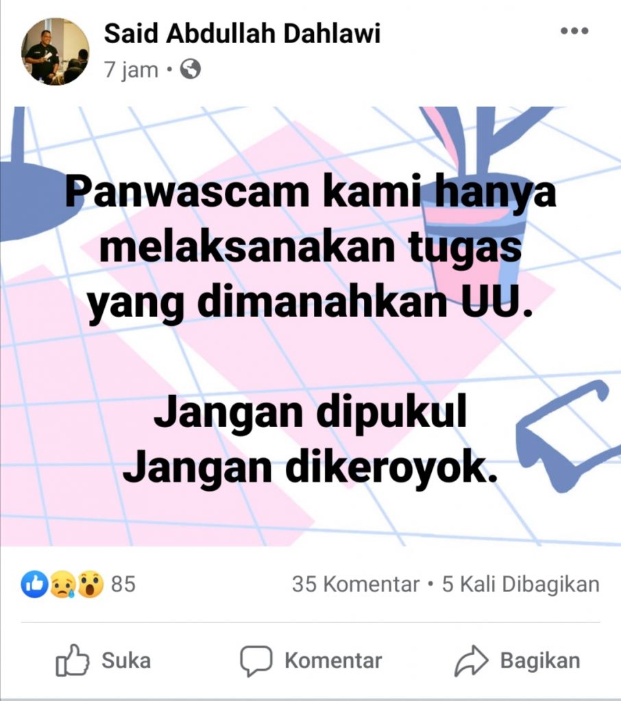 Dalam unggahannya, Said Abdullah Dahlawi menulis, “Panwascam kami hanya melaksanakan tugas yang dimanahkan UU. Jangan dipukul. Jangan dikeroyok,“.