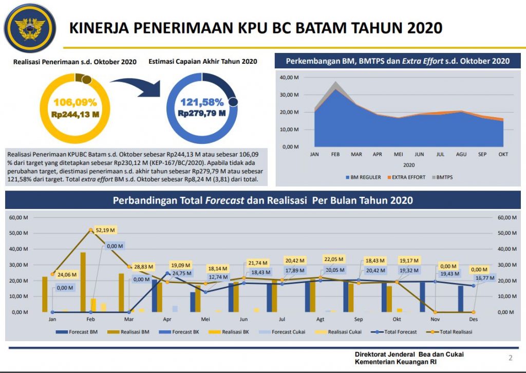 INIKEPRI.COM – Bea Cukai Batam terus optimalkan penerimaan negara di masa pandemi COVID-19. Memasuki kuartal IV, realisasi penerimaan Bea Cukai Batam telah mencapai Rp 244,13 M atau sebesar 106.09% dari target yang telah ditetapkan. Pernyataan tersebut disampaikan oleh Akbar Harfianto selaku Kepala Bidang Perbendaharaan dan Keberatan pada kegiatan Dialog Kinerja Organisasi.