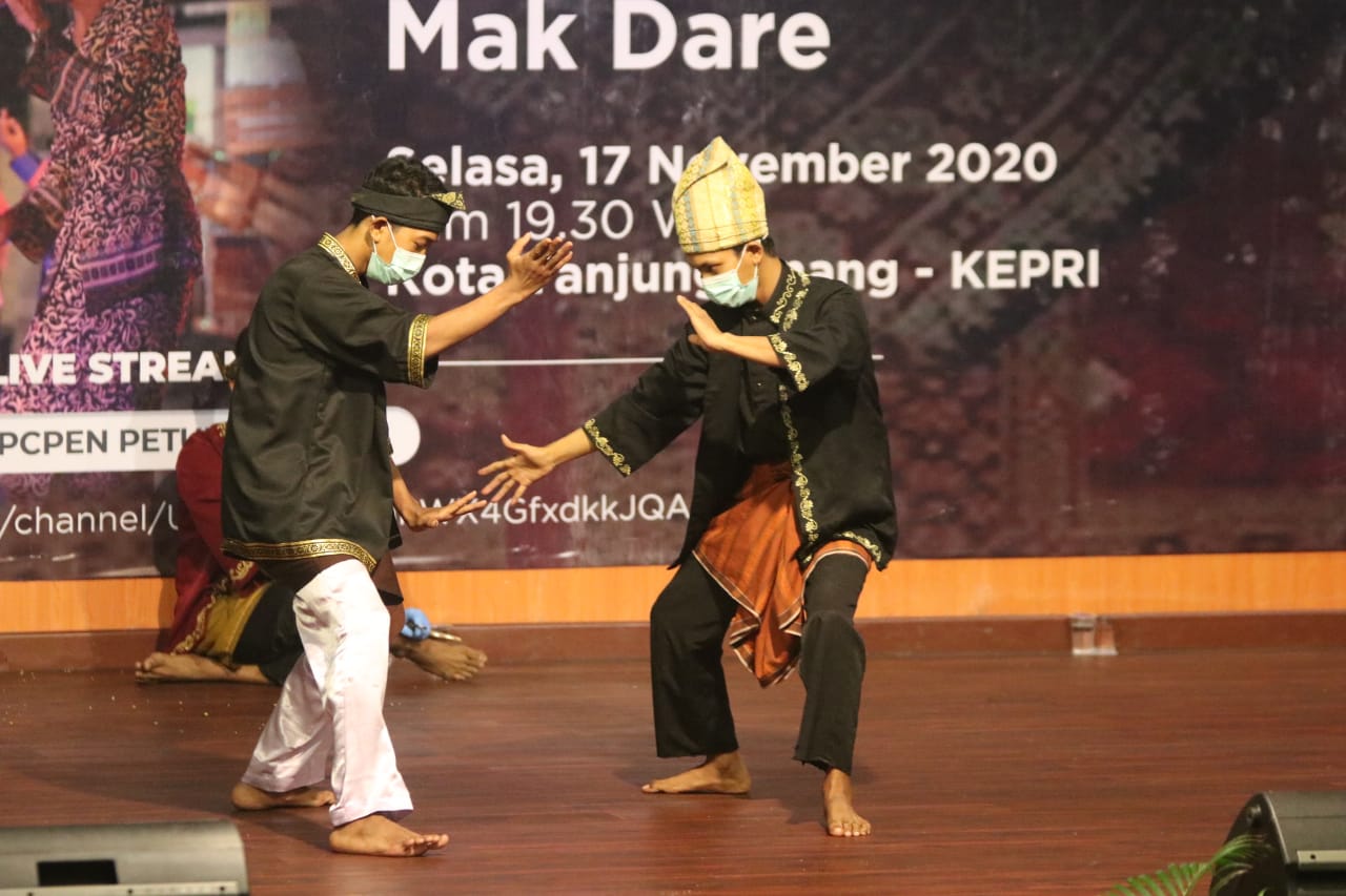 Dalam pegelaran yang dapat disaksikan melalui streaming YouTube KPC PENRA Kepri tersebut, sanggar Silat Zuriat Laksemana dan Dangkong Mak Dare melakukan kampanye protokol kesehatan dengan silat berpantun dan joget dangkong Melayu Mak Dare.