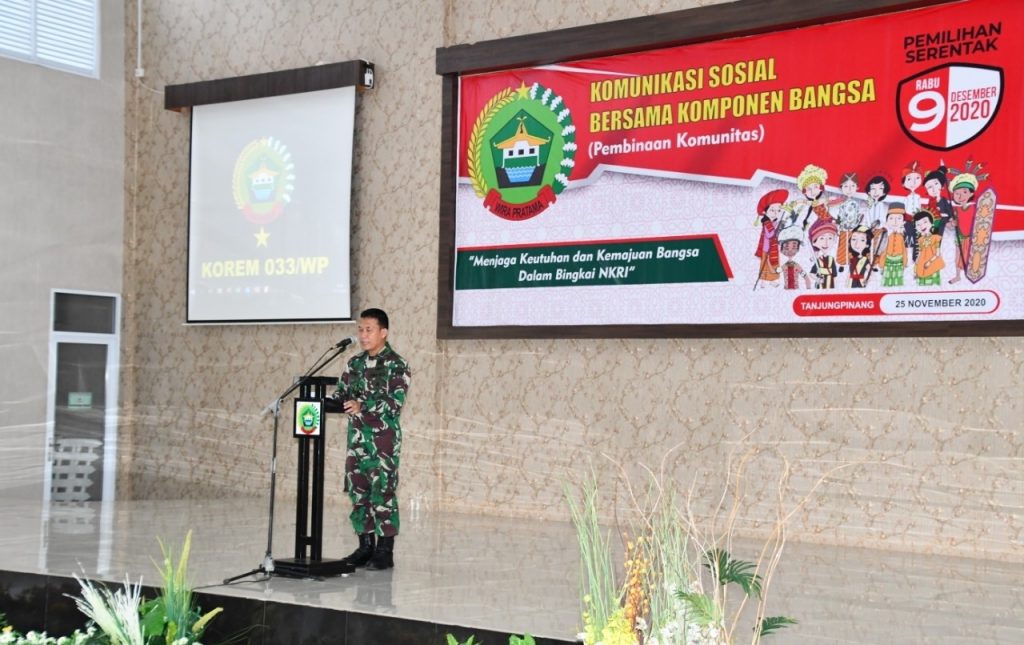 INIKEPRI.COM – Guna menumbuhkan kebanggaan terhadap Negara Kesatuan Republik Indonesia (NKRI), serta membangkitkan semangat persatuan dan kesatuan, Komando Resor Militer (Korem) 033/Wira Pratama (WP) menggelar kegiatan Komunikasi Sosial (Komsos) dengan Komponen Bangsa lainnya, guna Pembinaan Komunitas di wilayah Korem 033/WP Provinsi Kepulauan Riau (Kepri), di Gedung Serba Guna (GSG) Korem, di Jalan Sei Timun Km 14, Senggarang, Kota Tanjungpinang.