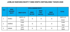 Sementara barang bukti, lanjut Richard, tahun 2020 lebih rendah dari 2019. Pada tahun 2019, BNNP Kepri menyita 146 Kilogram (Kg) lebih Narkotika jenis sabu. Sedangkan pada tahun 2020, BNNP Kepri menyita sebanyak 93 Kg sabu.