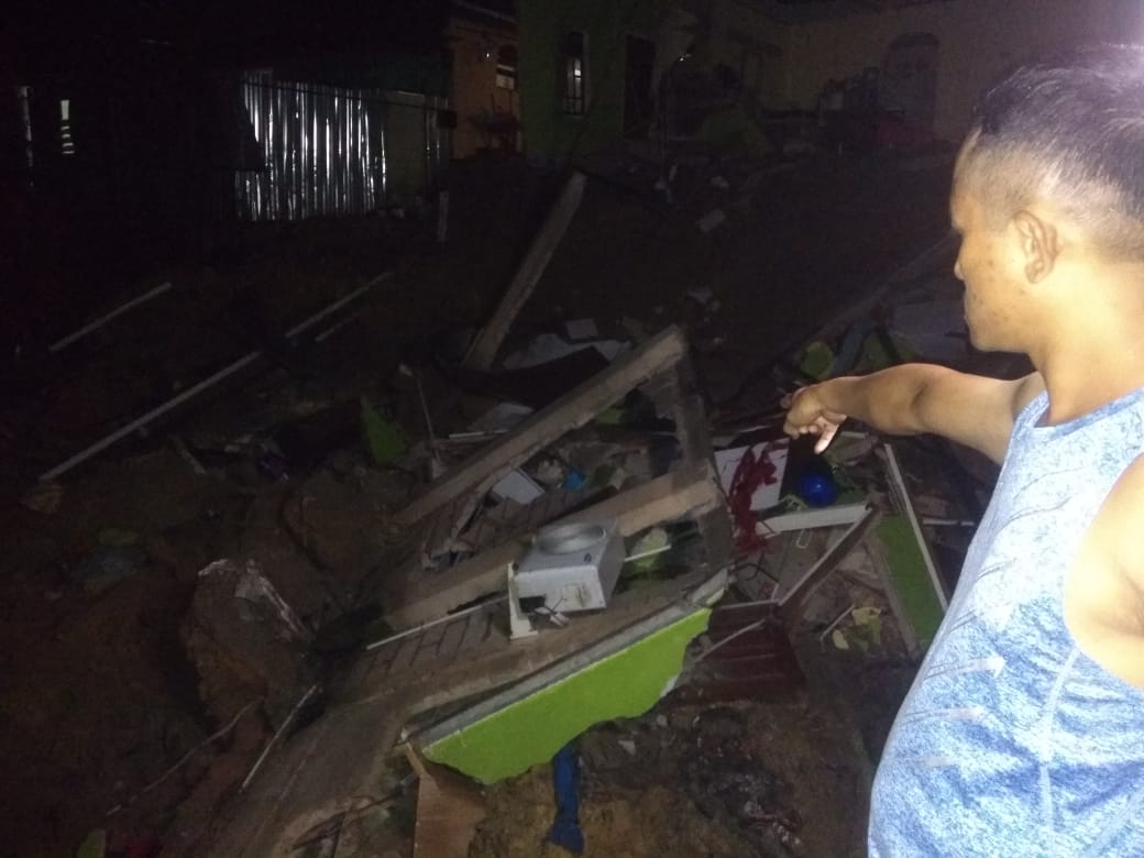 “Awal mula terjadinya kira-kira jam 23.30 WIB, waktu itu kan saya sudah baring tuh, mau tidur. Jadi dengar bunyi suara gletok..gletok, jadi saya bangun. Sekali bangun, saya pergi ke depan rumah tengok, rumah yang satu (1) itu sudah jatuh dia (ke bawah),” ujar Ramli kepada inikepri.com, di lokasi kejadian, Senin (11/1/2021).
