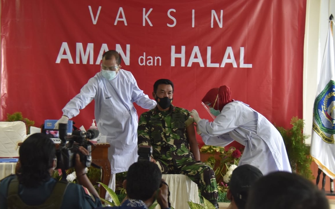 INIKEPRI.COM – Komandan Pangkalan Utama TNI Angkatan Laut (Danlantamal) IV Tanjungpinang, Laksamana Pertama TNI Indarto Budiarto, S.E., M.Han., bersama Gubernur Provinsi Kepri H Isdianto, S.Sos. M.M., Sekretaris Daerah (Sekda) Provinsi Kepri Dr H.T.S Arif Fadillah, S.Sos., M.Si., dan pejabat Forum Koordinasi Pimpinan Daerah (Forkopimda) Provinsi Kepri menerima suntik vaksin Covid-19 Sinovac perdana.
