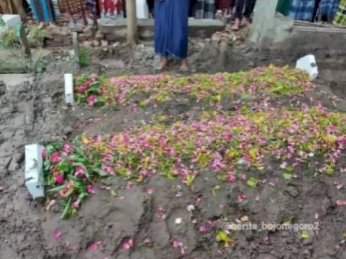 Dalam video yang diunggah pertama kali oleh akun Instagram @berita_bojonegoro2 pada Jumat (5/1/2021) terlihat warga menggotong dua jenazah dari rumah menuju pemakaman. Pasutri warga Jalan Letda Mustajab Sukorejo Bojonegoro Kota tersebut dimakamkan dalam satu liang lahat.