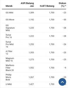 Dalam peraturan tersebut harga transaksi pasar (HTP) diperbolehkan didiskon 85% dari harga jual eceran. Artinya harga per batangnya masih bisa dipatok di Rp 1.647. Jika menggunakan harga ini sebagai patokan maka harga rokok masih terdiskon 15% – 38%.