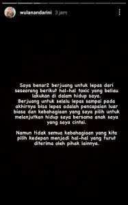Di instastory berikutnya, Wulan mengaku bersyukur telah dapat lepas dari seseorang berikut hal-hal toxic yang dialaminya selama ini.