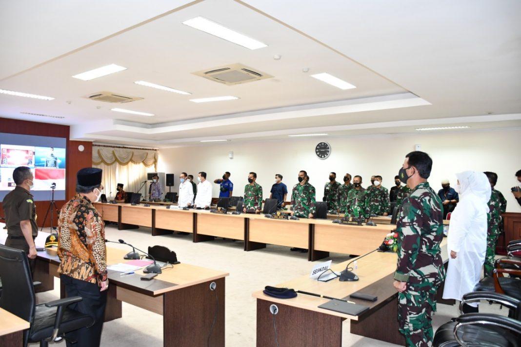 Danseskoal, Laksamana Muda TNI Dr Iwan Isnurwanto (kanan), menyerahkan buku executive summary kepada Wakil Gubernur Provinsi Kepri, Hj Marlin Agustina, dalam acara forum Strategi II dan KKDN jurusan Tanjungpinang di ruang rapat lantai IV Kantor Gubernur Kepri Dompak, Tanjungpinang, Kamis (22/4/2021). (ist)