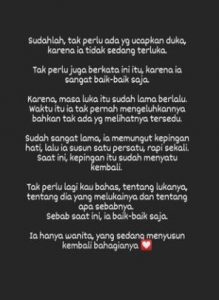 “Sudahlah, tak perlu ada yang ucapkan duka, karena ia tidak sedang terluka. Tak perlu juga berkata ini itu, karena ia sangat baik-baik saja. Karena masa luka itu sudah lama berlalu. Waktu itu ia tak pernah mengeluhkannya bahkan tak ada ada yang melihatnya tersedu. Sudah sangat lama, ia memungut kepingan hati, lalu ia susun satu per satu, rapi sekali. Saat ini, kepingan itu sudah menyatu kembali. Tak perlu lagi kau bahas, tentang lukanya, tentang dia yang melukainya dan tentang apa sebabnya. Sebab saat ini, ia baik-baik saja. Ia hanya wanita, yang sedang menyusun kembali bahagianya.”