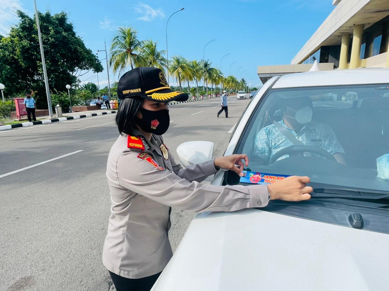 Imbauan dan ajak larangan mudik itu dilakukan dengan cara pemberian striker di kendaraan baik roda dua dan empat oleh Serdik Sespimmen Polri Dikreg angkatan 61, Kompol Yunita Stevani, di Bandara Internasional Hang Nadim Batam, pada Rabu (5/5/2021).