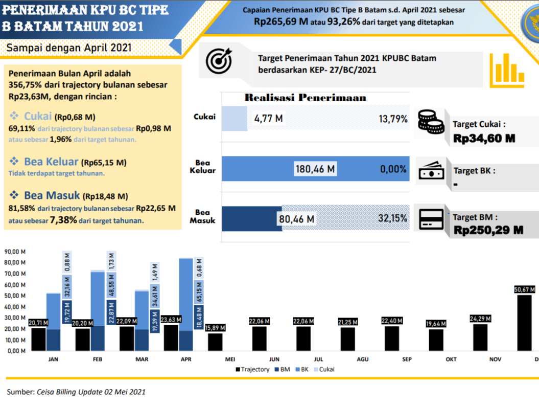 Berdasarkan data yang dihimpun dari CEISA Billing per 02 Mei 2021, keseluruhan penerimaan Bea Cukai Batam hingga bulan April yaitu bea masuk sebesar Rp80,46 miliar dari target Rp250,29 miliar, bea keluar sebesar Rp180,46 miliar dan cukai sebesar Rp4,77 miliar dari target Rp34,60 miliar.
