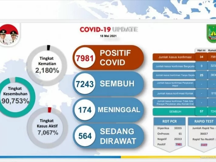 “Tingkat kematian 2,18 persen, tingkat kesembuhan 90,753 persen, dan tingkat kasus aktif 7,067 persen,” kata Ketua Bidang Kesehatan Satgas Penanganan COVID-19 Kota Batam, dr Didi Kusmarjadi dilansir dari ANTARA, Selasa (18/5/2021).