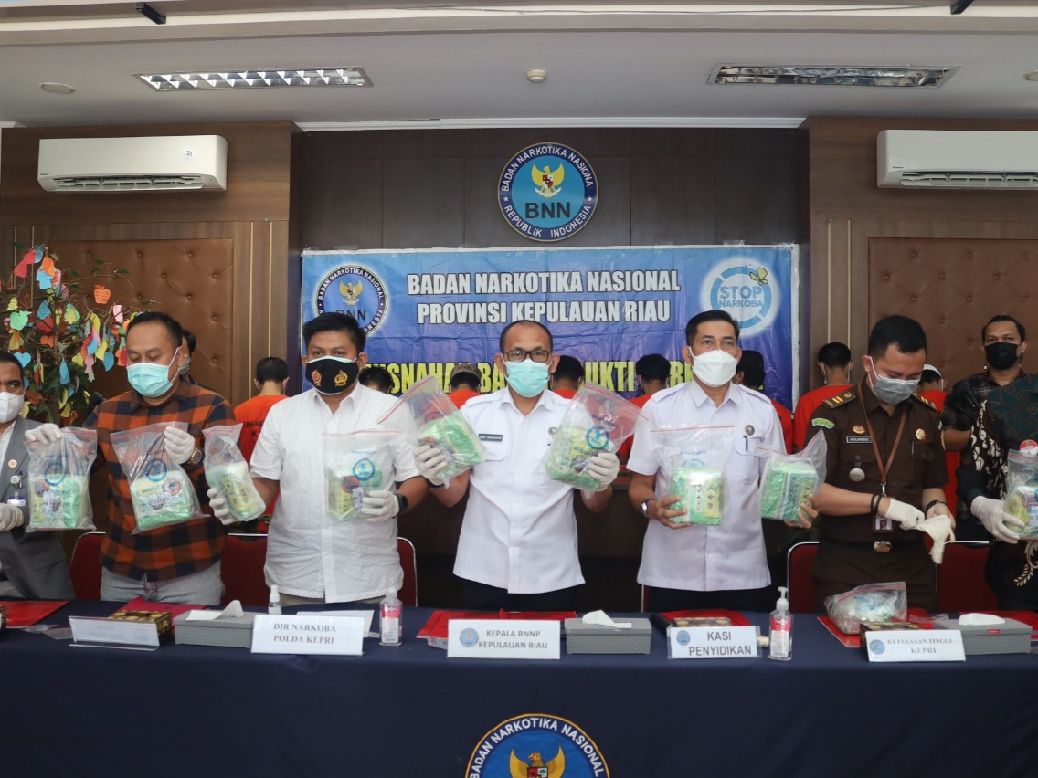 INIKEPRI.COM – Badan Narkotika Nasional Provinsi Kepulauan Riau (BNNP Kepri) memusnahkan barang bukti sabu seberat 19.618,82 gram, Kamis (20/5/2021). Barang bukti itu dikumpulkan dari empat Laporan Kasus Narkotika dengan jumlah delapan tersangka.