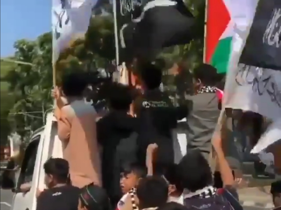 Dilihat dari video tersebut, tampak belasan bocah sambil duduk di belakang mobil pickup mengibarkan bendera Tauhid dan Palestina tanpa satu pun bendera Merah Putih.