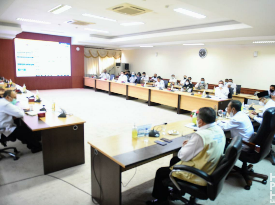 Tampak hadir Kepala Barenlitbang Andri Rizal, Kadis Perhubungan Junaidi, Ketua Harian BPBD Budiarto, Direktur RSUP RAT dr. Yusmanedi, Direktur Engku Haji Daud dr. Kurniakin WS Girsang, Wakahar Satgas Covid-19 Tjetjep Yudiana, Plt. Bakesbangpol Hasyim Ashari, Plt. Kabiro Pemerintahan sekaligus Kepala Sekretariat Satgas Covid-19 M. Darwin beserta Sekretaris Dinkes Rudi. (ET)