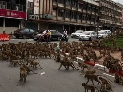 Hal ini benar-benar terjadi, dua kelompok monyet terlibat tawuran di sebuah jalanan di Thailand.