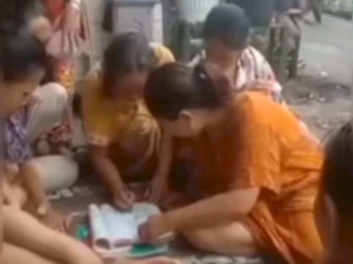 Menggunakan daster, emak-emak itu duduk di depan rumah. Mereka tampak serius mengerjakan tugas sekolah anaknya. Mereka tampak kompak mengerjakan soal berhitung.