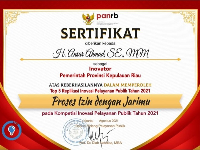 INIKEPRI.COM – Pada akhir Juli lalu Gubernur Kepulauan Riau menerima penghargaan sebagai inovator yang telah berhasil mengantarkan Pemerintah Provinsi Kepri masuk dalam ‘Top 5 Replikasi Inovasi Pelayanan Publik tahun 2021, Proses Izin Dengan Jarimu atau ‘SI JEMPOL’.