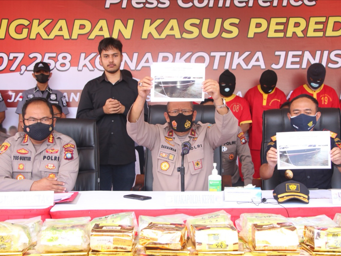 Hal itu diungkap saat konferensi pers yang dipimpin oleh Brigjen. Pol. Drs. Darmawan, M.Hum, yang didampingi oleh KA. Kanwil DJBC Akhmad Rofiq, Dir Narkoba KBP Muji Supriyadi, Kapolresta Barelang KBP Yos Guntur, SH, SIK, MH, KA BNNP Kepri, KA Bea Cukai Batam Ambang Priyonggo, Kajari Amanda, Kabidkum Polda Kepri KBP Djoko Trisulo, Ka Pengadilan Negeri Batam, Kabidhumas yang diwakili Kasubdit Multimedia AKBP Surya.