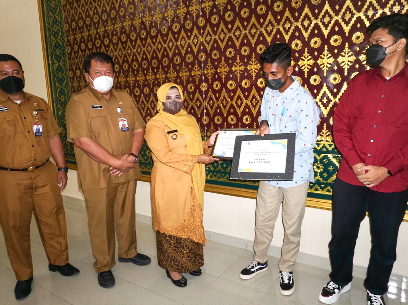 Saat menyerahkan hadiah, Wali Kota Rahma didampingi Kepala Dinas Kominfo, Ruli Friady, Kabag Prokopim, Boby Wira Satria, dan Ketua Bidang Pendidikan Aji Tanjungpinang, Endra Kaputra. (ET)