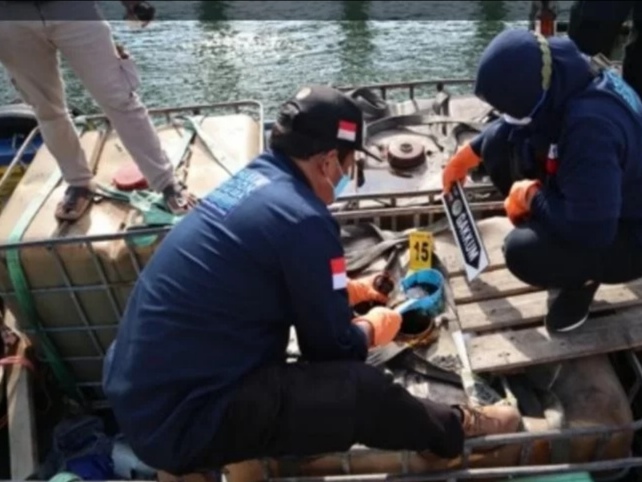 Kapal SB Cramoil Equity mengangkut 20 kontainer jenis IBC tank berkapasitas 1.000 liter, berisi limbah B3 cair dari Pelabuhan Singapura dengan tujuan laut lepas.