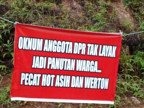 Di spanduk lainnya, bahkan nama kedua wakil rakyat itu tertulis jelas. “Oknum anggota DPR tak layak jadi panutan warga. Pecat Hot Asih dan Werton,” tulis spanduk lainnya.