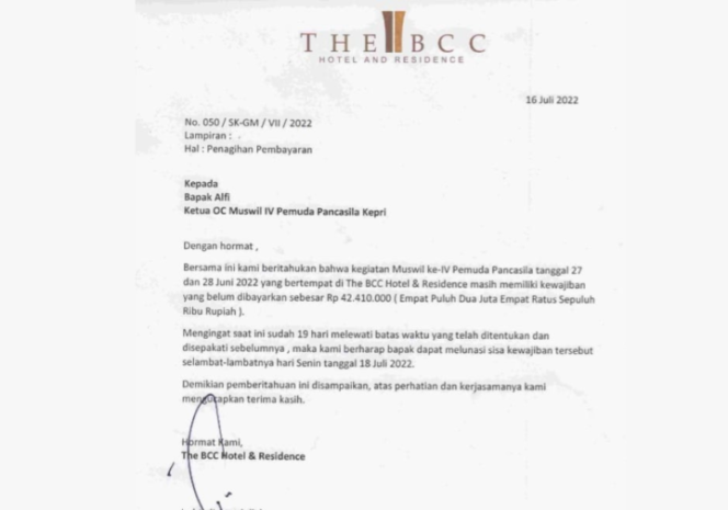 Alfi juga mengatakan saat ini dirinya sudah menerima surat dari pihak Hotel, agar segera melunasi kekurangan yang ditunggak oleh panitia penyelenggara Muswil, dan memberikan tenggat waktu paling lambat hari Senin (18/7) mendatang seluruh pembayaran yang ditunggak untuk dapat diselesaikan.