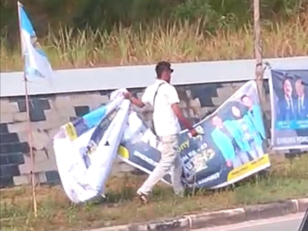 Dalam sebuah video yang diterima, terlihat dua orang yang mengendarai sepeda motor warna merah, mencopot dan merusak spanduk-spanduk tersebut.