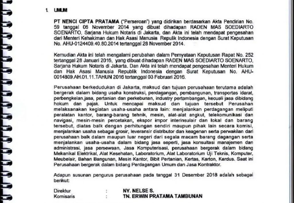 PT Nenci Citra Pratama didirikan berdasarkan akta pendirian bernomor 59 pada 6 November 2014. Adapun susunan pengurus PT Nenci Citra Pratama per tanggal 31 Desember 2018, sebagai direktur adalah Nelse S dan Erwin Pratama Tambunan bertindak sebagai komisaris.