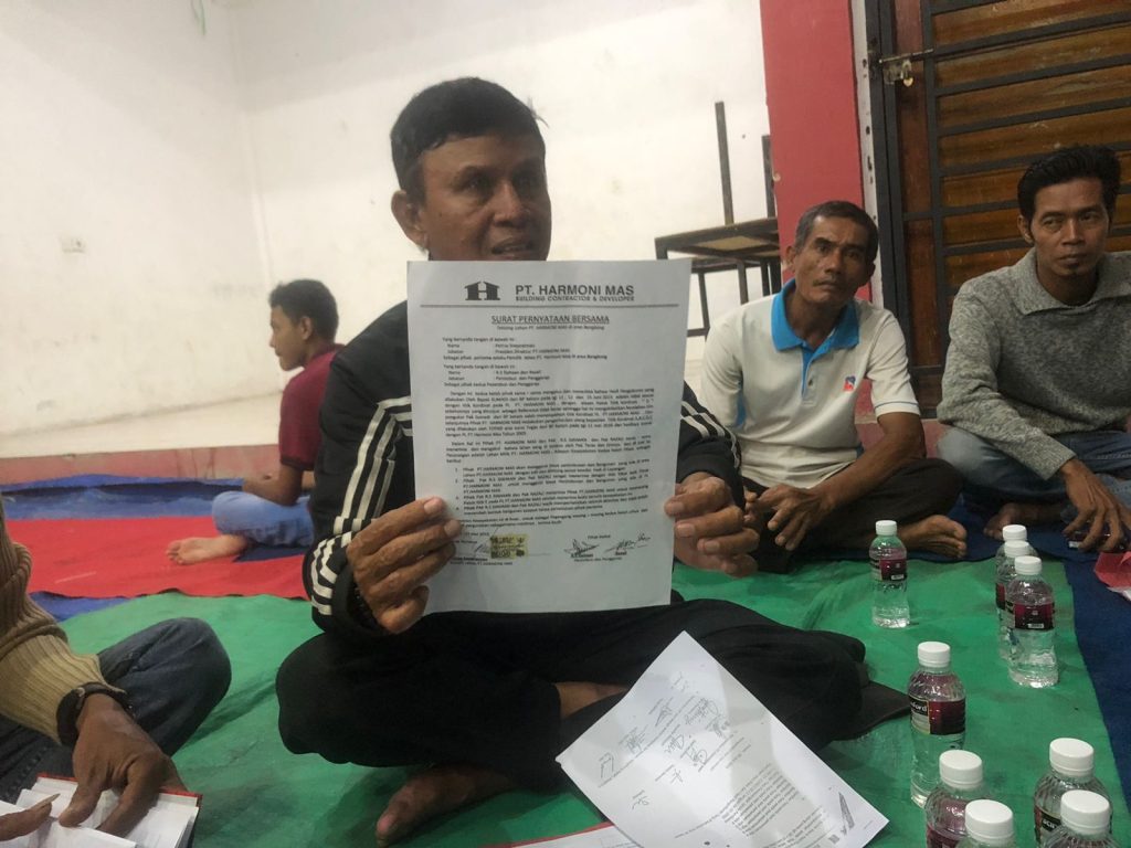 “Kami kembali dipanggil oleh pemilik PT Harmoni Mas. Mereka mengatakan bahwa kesalahan pengukuran lahan murni dari pihak PT Harmoni Mas dan mereka tetap bersikeras menarik lahan yang telah dibangun warga saat ini,” tegasnya.