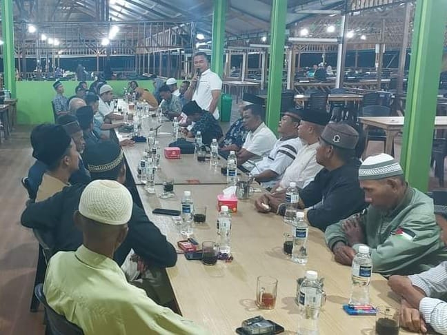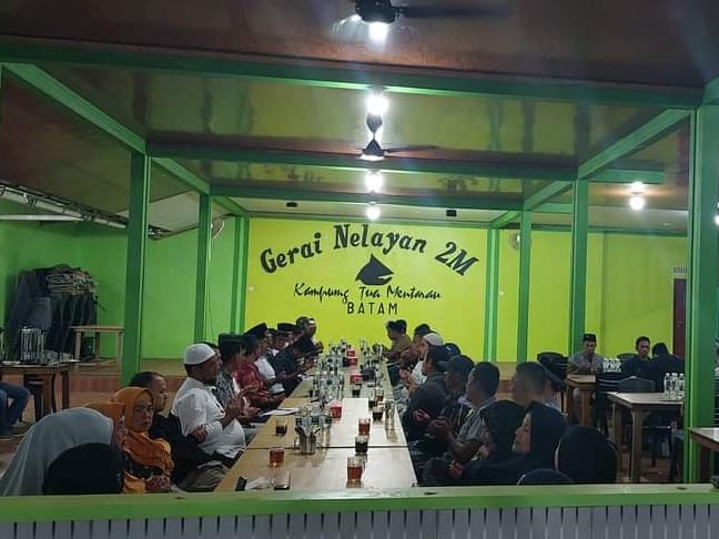 Sekretaris DPC Partai Gerindra Kota Batam Aweng Kurniawan bersilaturahmi dengan tokoh masyarakat hinterland dan mainland, di Gerai Nelayan 2M, Kampung Tua Mentarau, Tiban, Kota Batam, Kepri, Minggu 26 Februari 2023 malam. Foto: INIKEPRI.COM