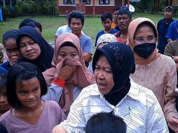 Menteri Sosial, Tri Rismaharini saat bersama warga pegungsi bencana tanah longsor di Desa Payak, Serasan Timur, Natuna, Kepulauan Riau, Jumat (10/3/2023). Foto: ANTARA/Cherman/aa.