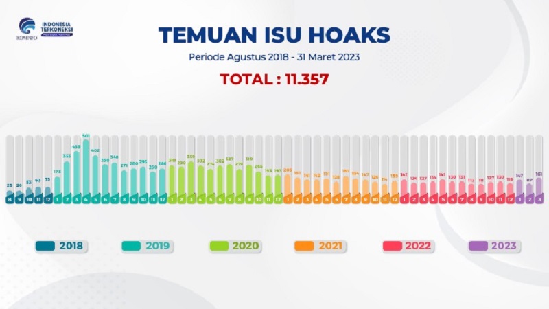 “Total sejak Agustus 2018 sampai dengan 31 Maret 2023, Tim AIS Kementerian Kominfo mengidentifikasi sebanyak 11.357 isu hoaks,” ungkap Rhina.