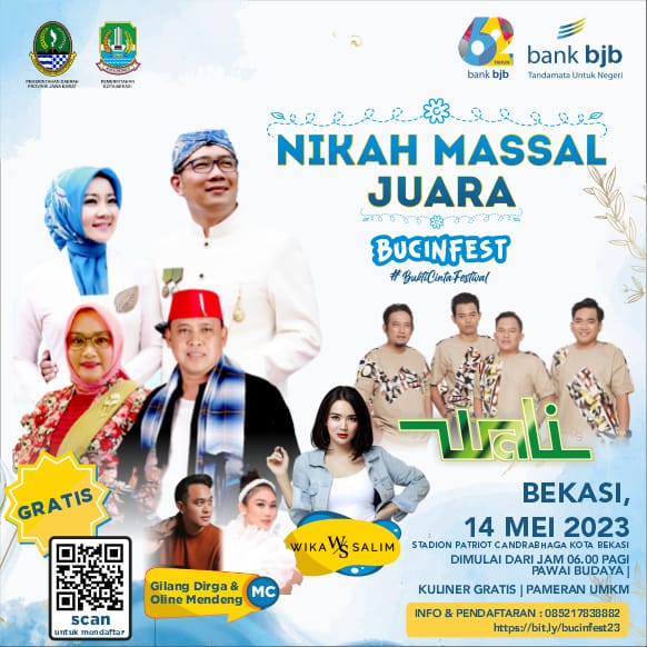 INIKEPRI.COM – bank bjb bekerja sama dengan Pemerintah Provinsi Jawa Barat menggelar Bukti Cinta Festival alias Bucinfest ‘Nikah Massal Juara’ di Stadion Patriot Candrabhaga, Kota Bekasi, Pukul 06.00 Minggu 14 Mei 2023.