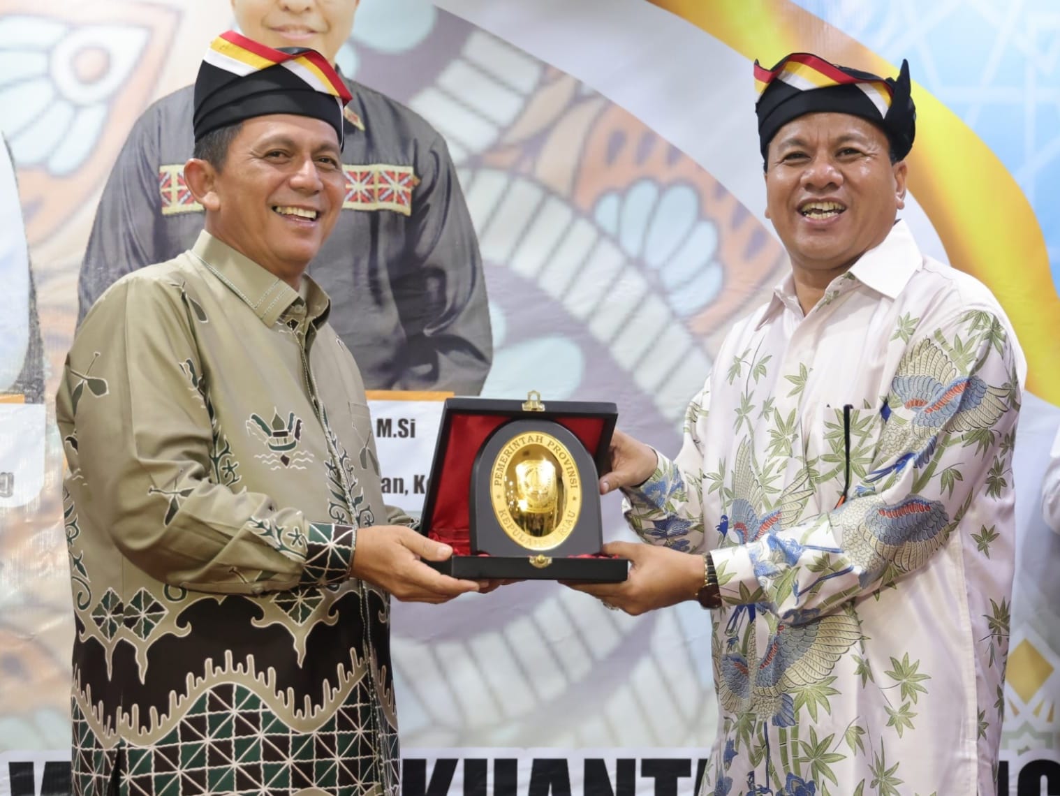 Gubernur Ansar yang tiba mengenakan pakaian batik dengan motif khas Kuansing disambut dengan pemasangan tanjak yang juga khas Kuansing oleh Ketua IWAKUSI Tanjungpinang – Bintan Huzaifa Dadang AG, sebagai penanda diterimanya Gubernur Ansar sebagai Warga Kuansing.