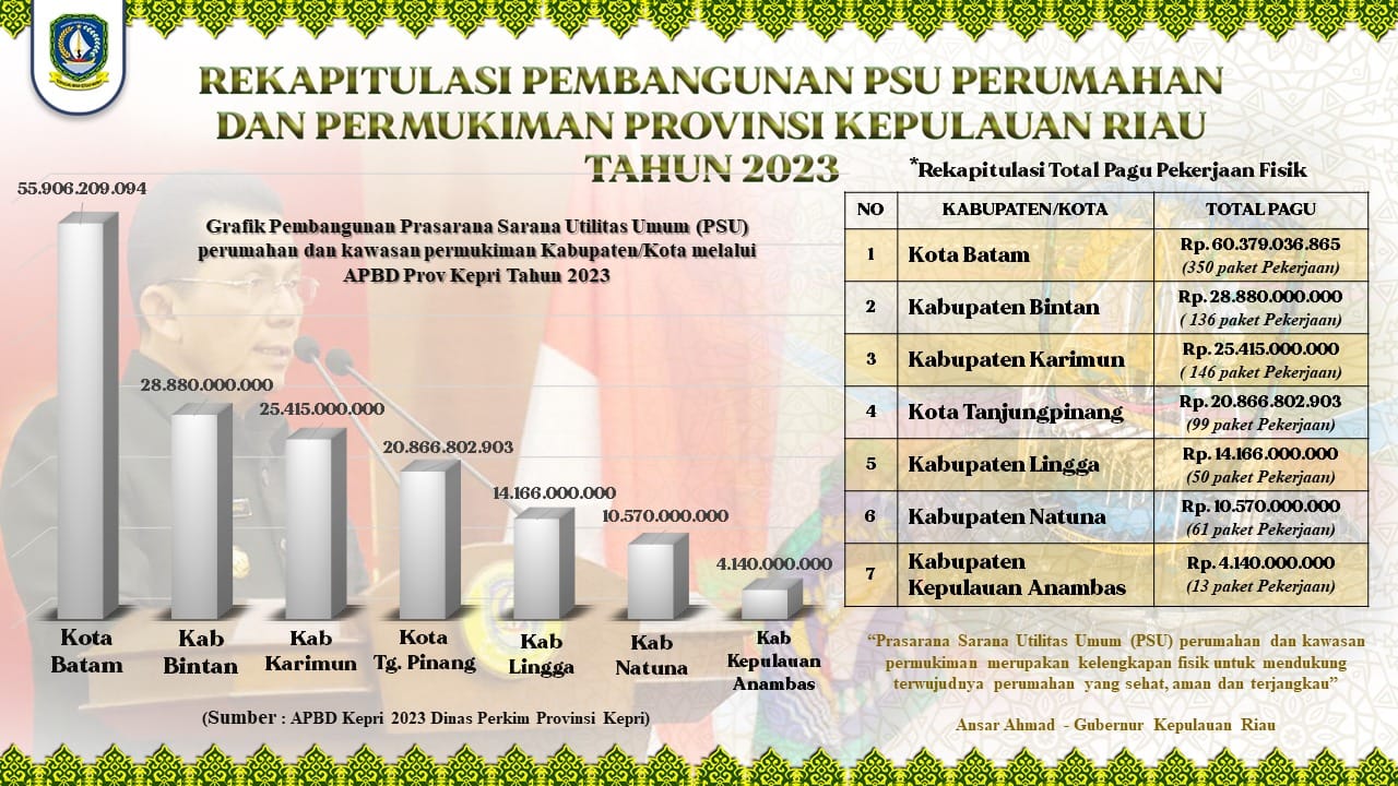 Begitu pula pada APBD Tahun 2022, Kota Batam mendapatkan porsi anggaran PSU terbesar dengan jumlah Rp60.379.036.865, dilanjutkan Kabupaten Karimun Rp36.009.274.933, Kota Tanjungpinang Rp22.631.760.710, Kabupaten Bintan Rp19.110.060.175, Kabupaten Natuna Rp11.501.884.963, Kabupaten Kepulauan Anambas Rp5.140.111.298, dan Kabupaten Lingga Rp3.535.682.349.