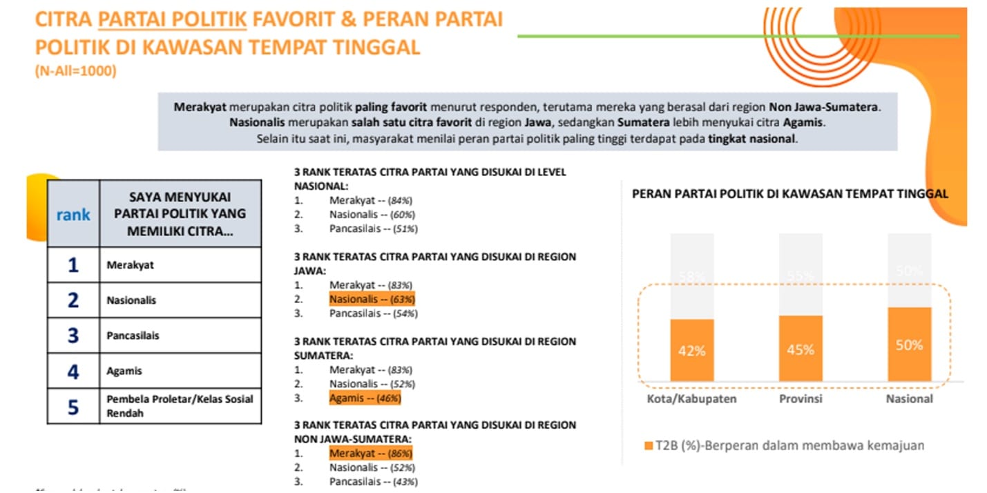 “Responden memberikan presentase 84 untuk citra parpol yang paling banyak difavoritkan di level nasional, yaitu citra merakyat. Disusul dengan citra nasionalis dengan presentase 60 dan citra pancasilais dengan presentase 52. Bila ditengok di tiap regionnya juga terdapat temuan bahwa citra nasionalis merupakan salah satu citra favorit di region Jawa, sedangkan Sumatera lebih menyukai citra Agamis,” terangnya.