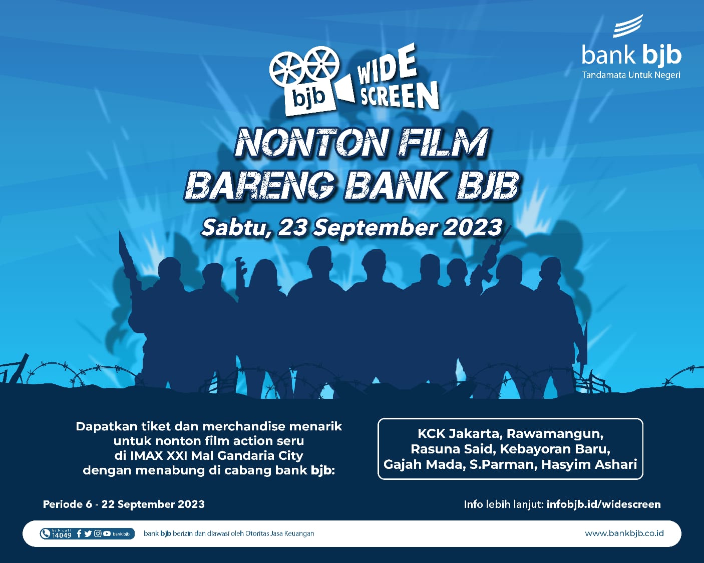 Kegiatan bjb WideScreen Expendables 4 akan diselenggarakan pada hari Sabtu, 23 September 2023 di XXI Gandaria City Jakarta. Program promosi bjb WideScreen dapat diikuti oleh nasabah baru maupun eksisting dan berlaku mulai 6 – 22 September 2023.