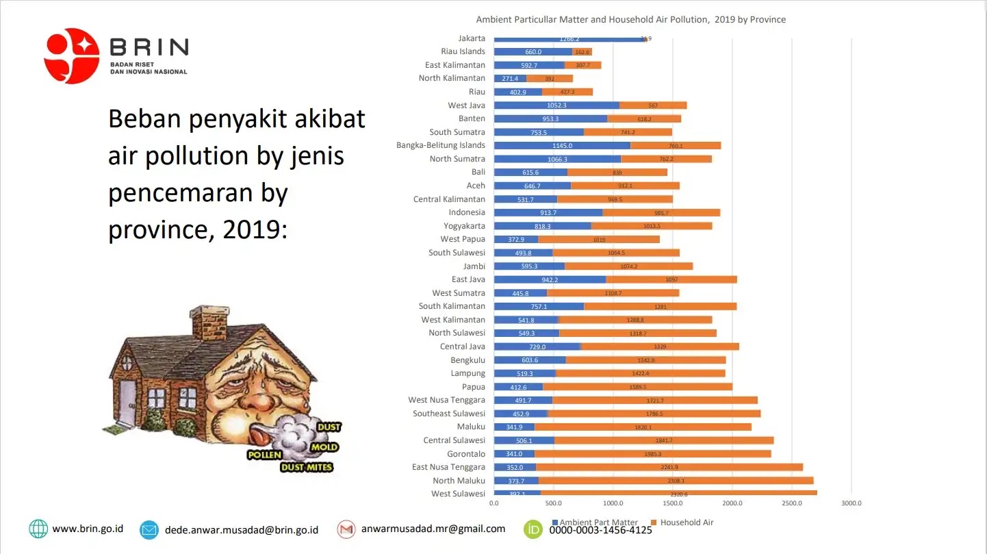 Data tersebut berdasarkan Analisa dari Peneliti Ahli Utama Pusat Riset Kesehatan Masyarakat dan Gizi Badan Riset dan Inovasi Nasional (BRIN) Dede Anwar Musadad, yang melakukan riset terkait beban penyakit akibat pencemaran udara. Hal itu ia sampaikan Ia sampaikan dalam webinar Pusat Riset Kesehatan Masyarakat dan Gizi yang diselenggarakan pada Senin (29/4/2024).