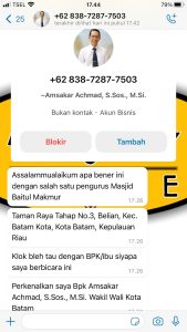 Informasi yang INIKEPRI.COM himpun, penipu tersebut melalui pesan WhatsApp menawarkan program bantuan donasi kepada masjid.