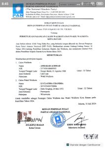 Keputusan resmi dari DPP PAN untuk mengusung Amsakar-Li Claudia tertuang dalam surat keputusan bernomor: PAN/A/Kpts/KU-SJ/291/VII/2024.