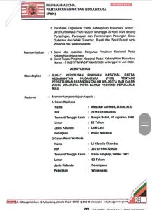 Dalam surat keputusan yang diterima INIKEPRI.COM, Senin (22/7/2024) dinihari, Pimnas PKN memberikan persetujuan kepada Amsakar Achmad dan Li Claudia Chandra untuk mendaftarkan diri sebagai pasangan calon wali kota dan wakil wali kota Batam.