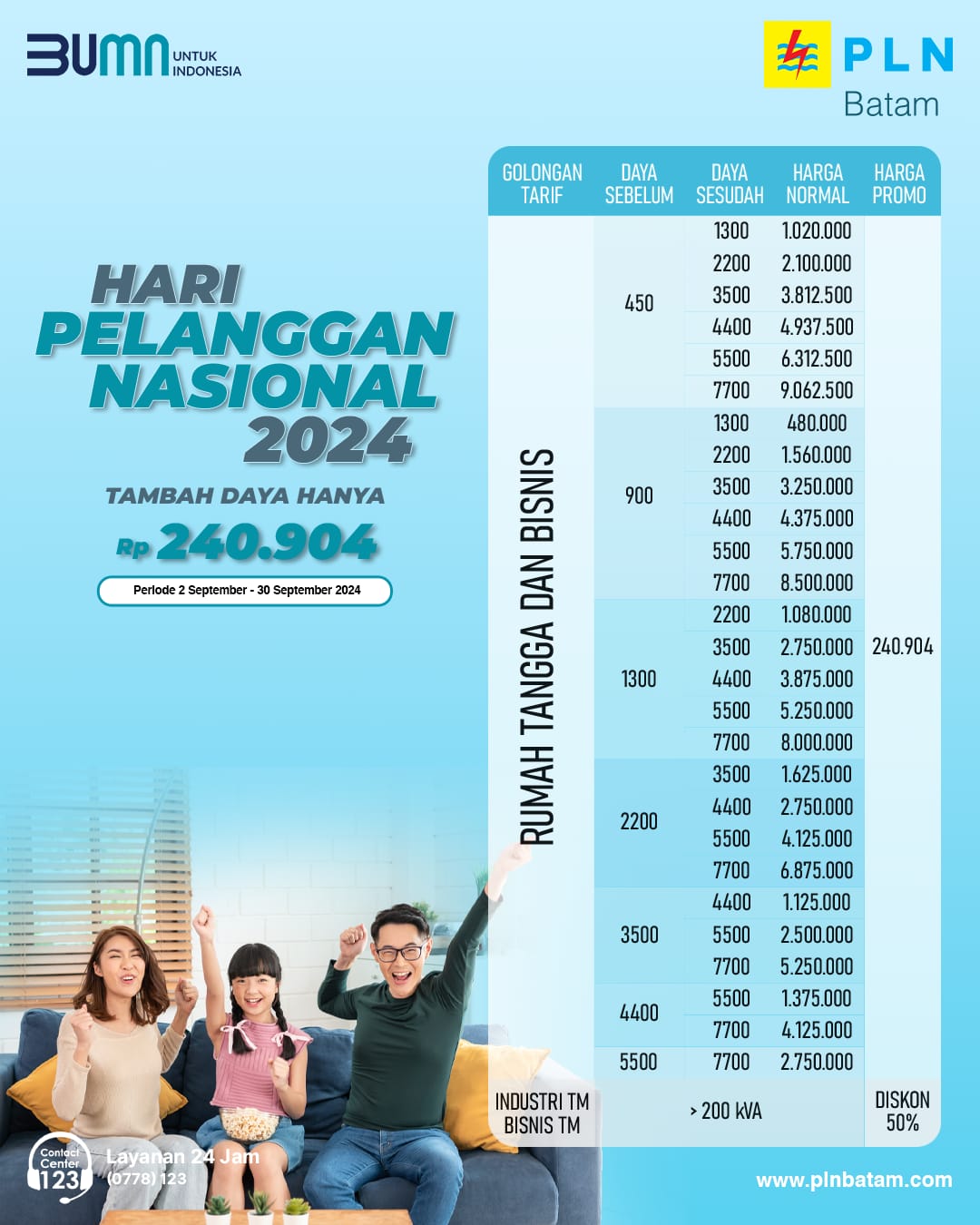 Pelanggan PLN Batam dapat menikmati promo keringanan biaya penyambungan tambah daya hanya dengan harga Rp240.904 untuk semua golongan tarif listrik tegangan rendah dari 450 volt ampere (VA) hingga 5.500 VA. Program promo tambah daya ini berlaku mulai 2 September hingga 30 September 2024.