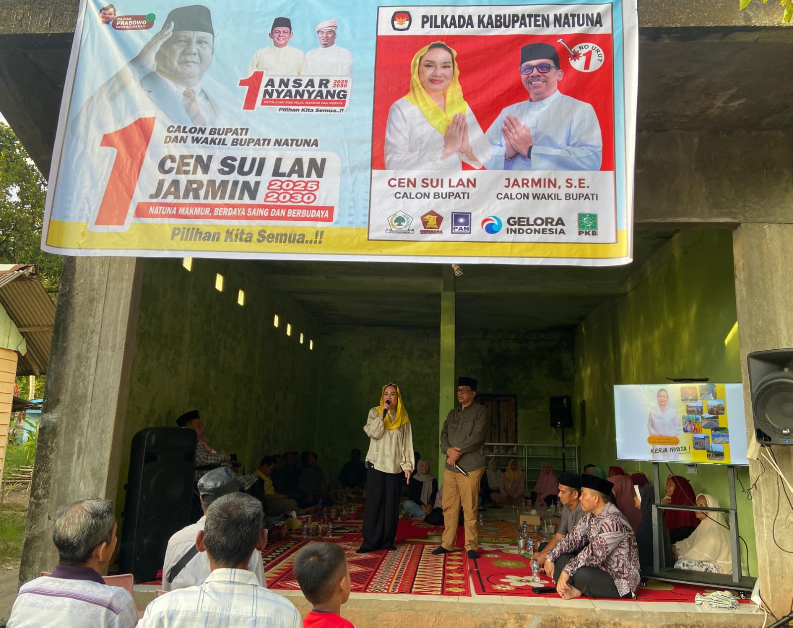 INIKEPRI.COM – Pasangan calon Bupati dan Wakil Bupati Natuna nomor urut satu, Cen Sui Lan dan Jarmin Sidik (Cermin), melaksanakan kampanye di Dusun Mahligai, Desa Sungai Ulu, Kecamatan Bungaran Timur, Sabtu, (5/10/2024).