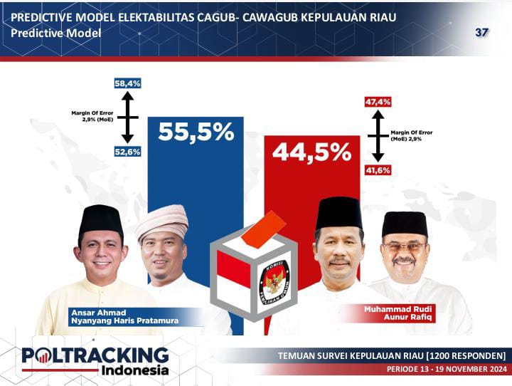 “Ansar Ahmad-Nyanyang Haris Pratamura memperoleh angka elektabilitas 55,5%, dengan konsekuensi MoE 2,9%, tertinggi 58,4% dan terendah 52,6%. Sedangkan elektabilitas Muhammad Rudi – Aunur Rafiq 44,5%, dengan konsekuensi MoE 2,9%, tertinggi 47,4% dan terendah 41,6%,” jelasnya.