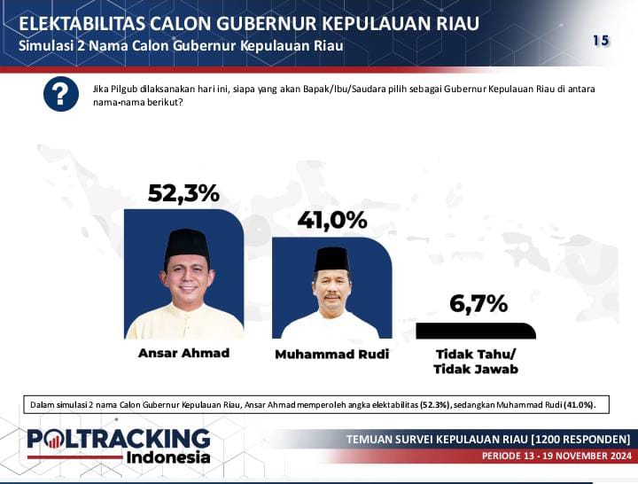 Untuk simulasi tunggal, Poltracking Indonesia menemukan hasil survei, elektabilitas Ansar Ahmad masih jauh lebih unggul daripada Muhammad Rudi.