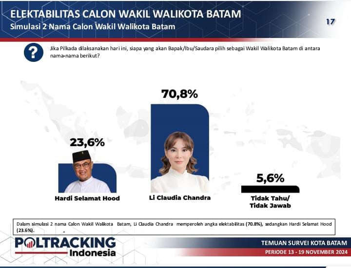 Kedua, kata Masduri, Pada simulasi Tunggal Calon Wakil Walikota Batam, Li Claudia Chandra memperoleh angka elektabilitas 70.8%, sedangkan Hardi Selamat Hood 23.6%.