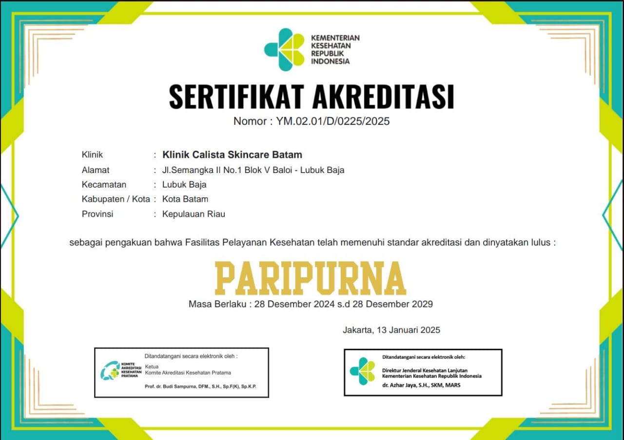 Calista Skincare Batam sendiri ini telah terakreditasi paripurna, sebuah puncak akreditasi tertinggi untuk klinik kecantikan.