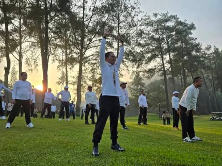 Wali Kota Batam yang juga Ex Officio Kepala BP Batam Amsakar Achmad mengikuti senam sehat di Lembah Tidar Magelang pada hari ke-2 Retreat Kepala Daerah. Foto: INIKEPRI.COM