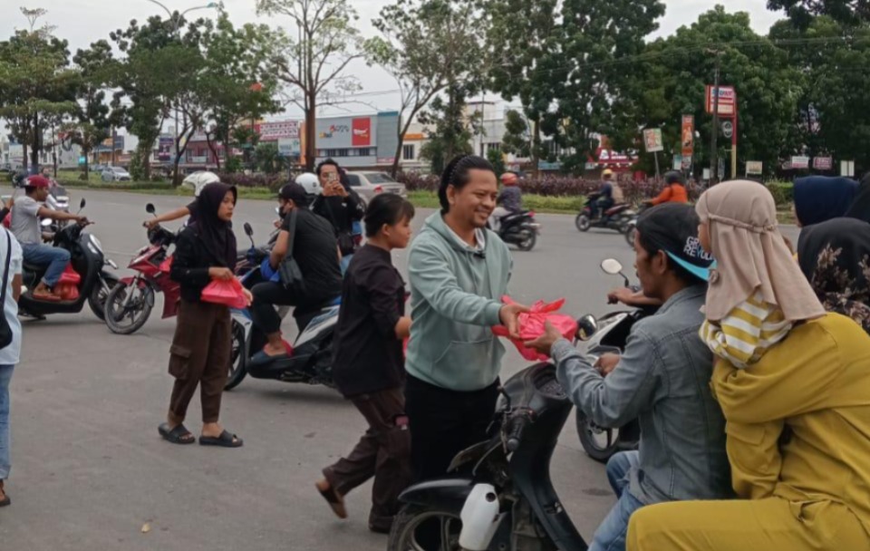 Pada pukul 17.30 WIB, mereka mulai membagikan 100 cup minuman dan 25 paket takjil kepada pengendara dan pejalan kaki di sekitar kawasan masjid.